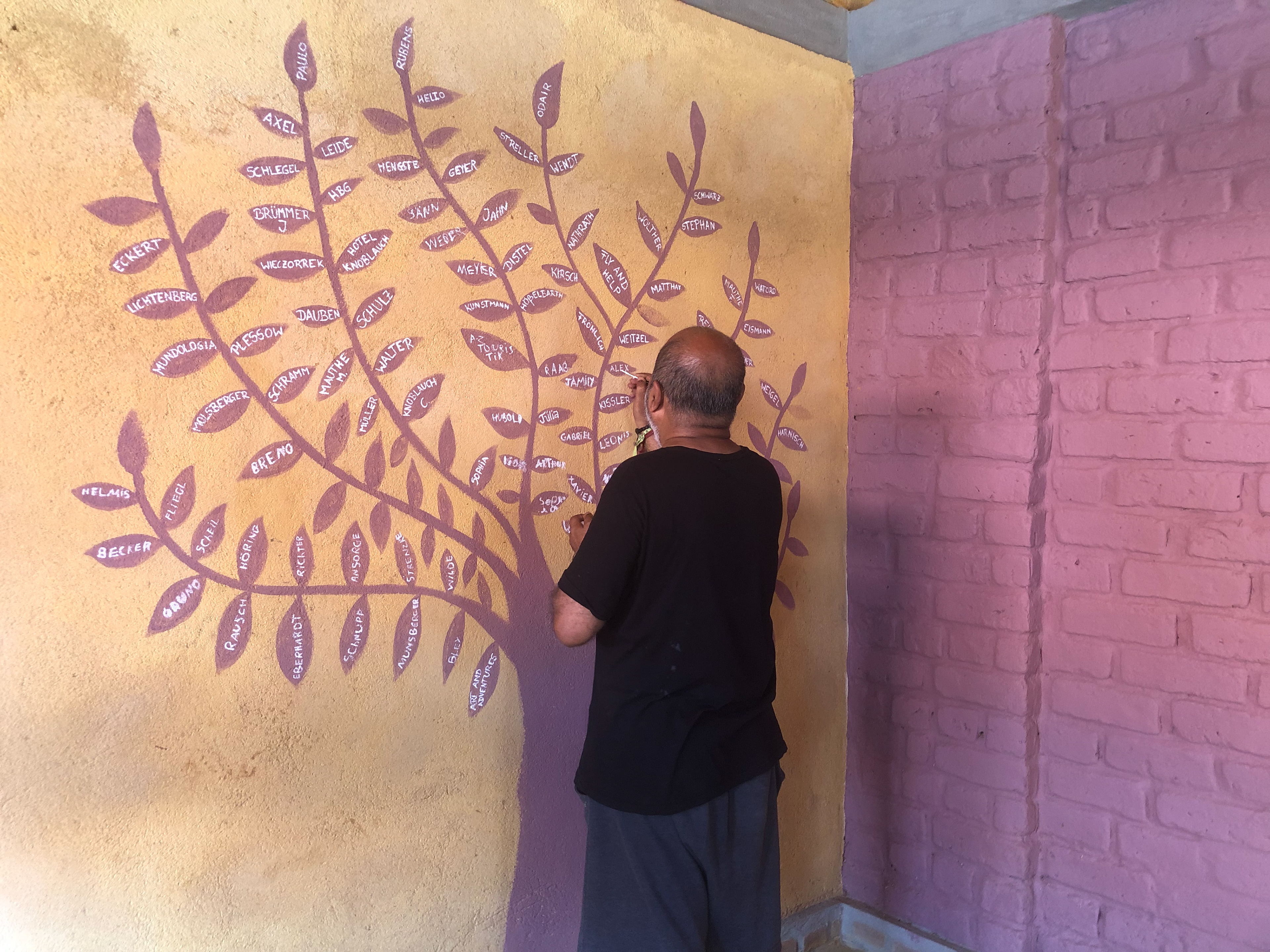 Kaushik, artista indiano, junto com jovens, na pintura da coletiva com tinta de terra.