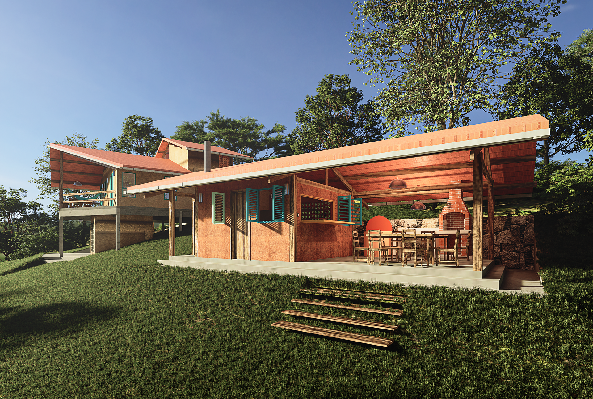 Cozinha externa da casa amaré, projeto para terreno localizado em Diogo, no litoral norte da Bahia. A proposta foi desenvolvida para conceber um espaço com cozinha ampla, integrada com a parte externa, mas que ao mesmo tempo pudesse ser fechada. Na parte externa, era importante que coubessem mesas para receber amigos e também churasqueira e forno a lenha, com uma pia de apoio. Como esta etapa do projeto será construída posteriormente, as portas e janelas podem sofrer alteração de acordo com a disponibilidade de peças de reuso. O fechamento do vaso sanitário foi pensado para ser construído com peças de reuso. As paredes serão de taipa.